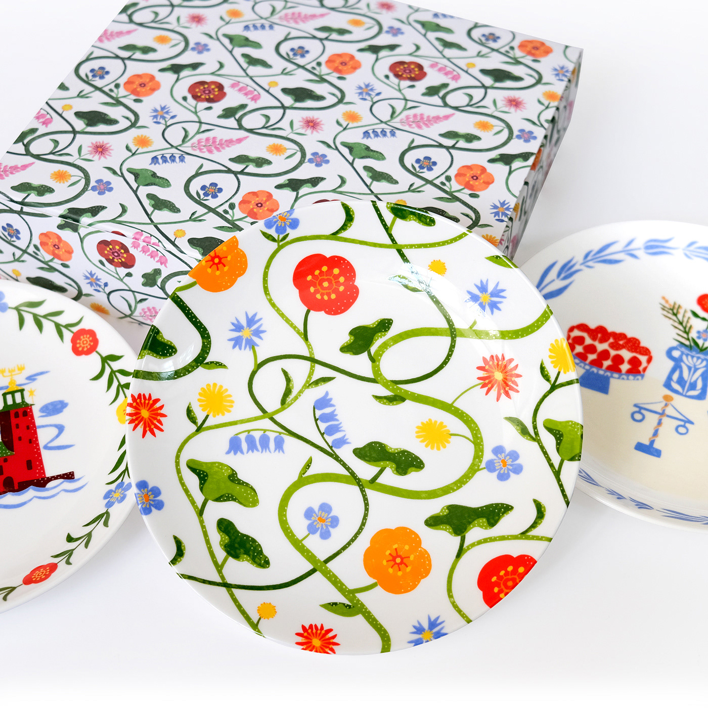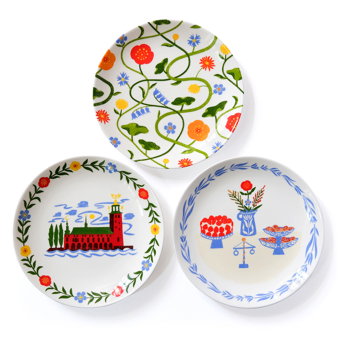 I had the pleasure of working together with Cartier and Gustavsberg Porslinsfabrik to create this exclusively limited-edition series of handmade plates. The design pays tribute to Nordic nature and captures the essence of a Swedish summer – featuring a pattern of blooming wildflowers, some Swedish fika, and the iconic Stockholm City Hall